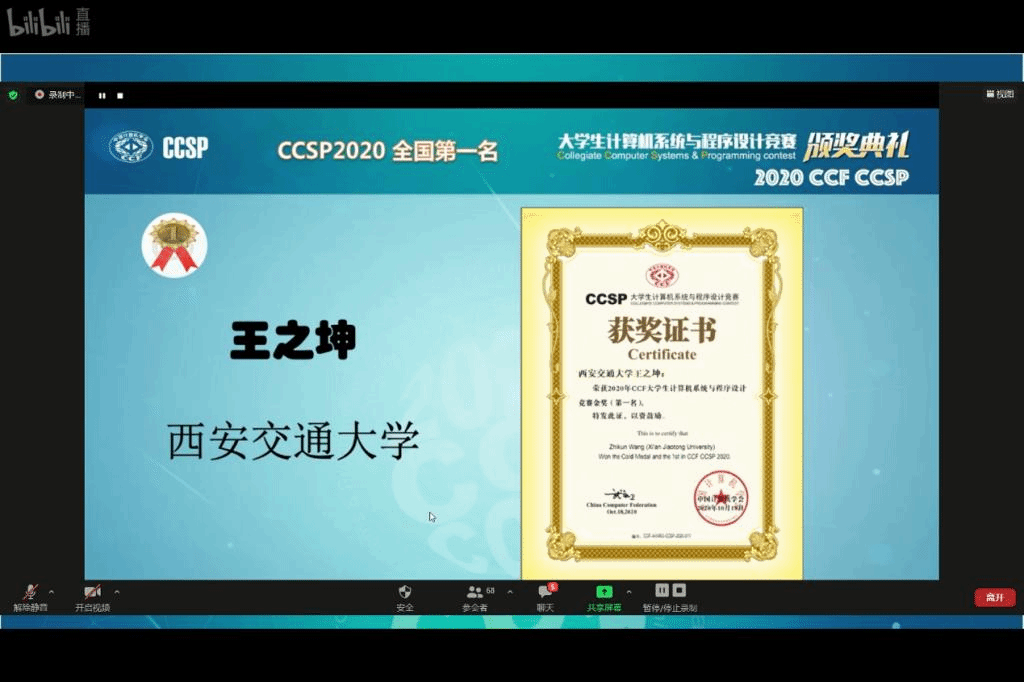 王之坤同学在颁奖会发表感言表示,“CCSP比赛最大的特点就是题目比较长,选手们往往需要在短时间内学习和应用一些并不完全熟悉的知识并编写大量代码进行实现和优化。我觉得能够在CCSP2020取得好成绩,主要来自之前参加信息学竞赛和其他算法竞赛所带来的代码水平和稳定的心态。竞赛使我感受到计算机系统独有的魅力,这次获奖经历也勉励我要努力学习计算机系统知识,提高自己的知识水平。”